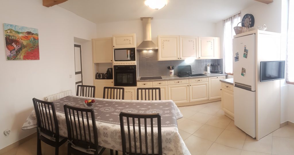 Cuisine ouverte totalement équipée, grande table extensible, et télévision orientable